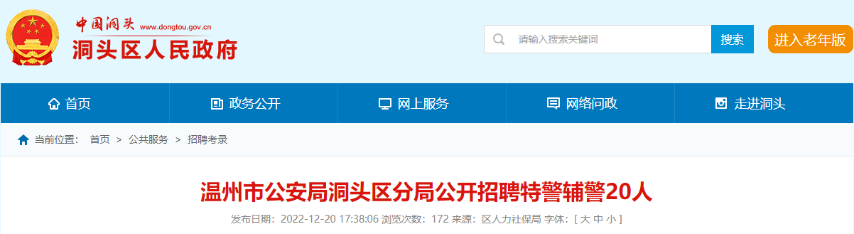 原文标题:温州市公安局洞头区分局公开招聘特警辅警20人