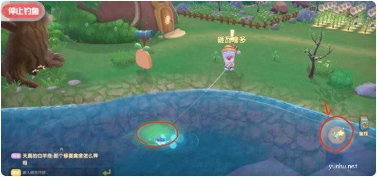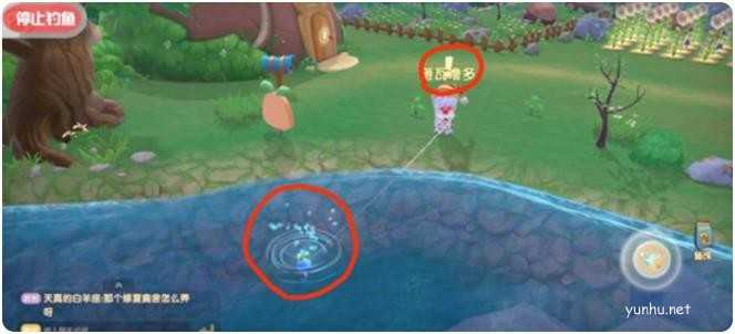 静待一小会,有鱼咬竿的时候,池子里的小拉姆鱼标会上下沉浮,溅起水花~还有我们继几的头顶,会出现一个黄色的感叹号!
