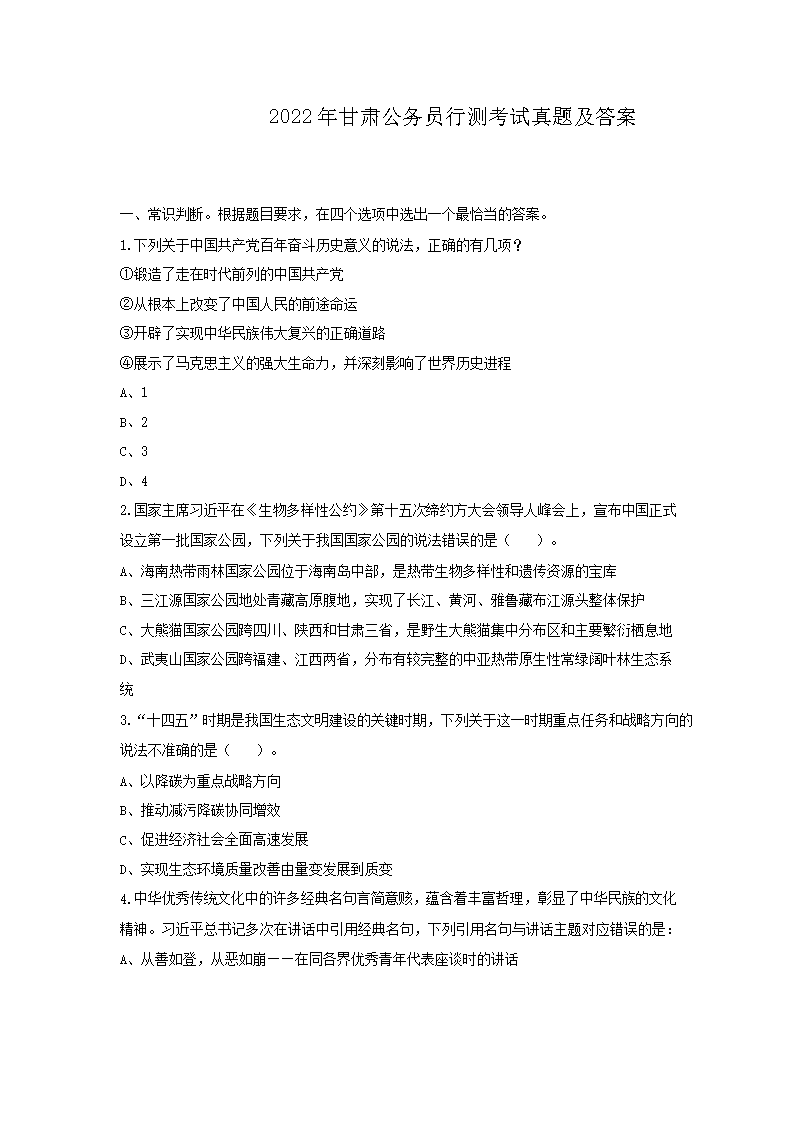 2022年甘肃公务员行测考试真题及答案(Word版)09-01