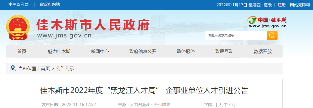人才引进公告在佳木斯市人民政府网、佳木斯先锋网、“才聚三江”微信公众号和春风人才网上发布,公告时间为2022年11月16日至2022年11月22日。