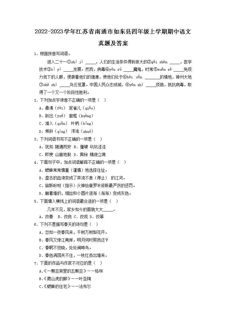 【文档预览】 文档大全网整理发布2022-2023学年江苏省南通市如东县四年级上学期期中语文真题及答案(Word版),前五页预览如下:
