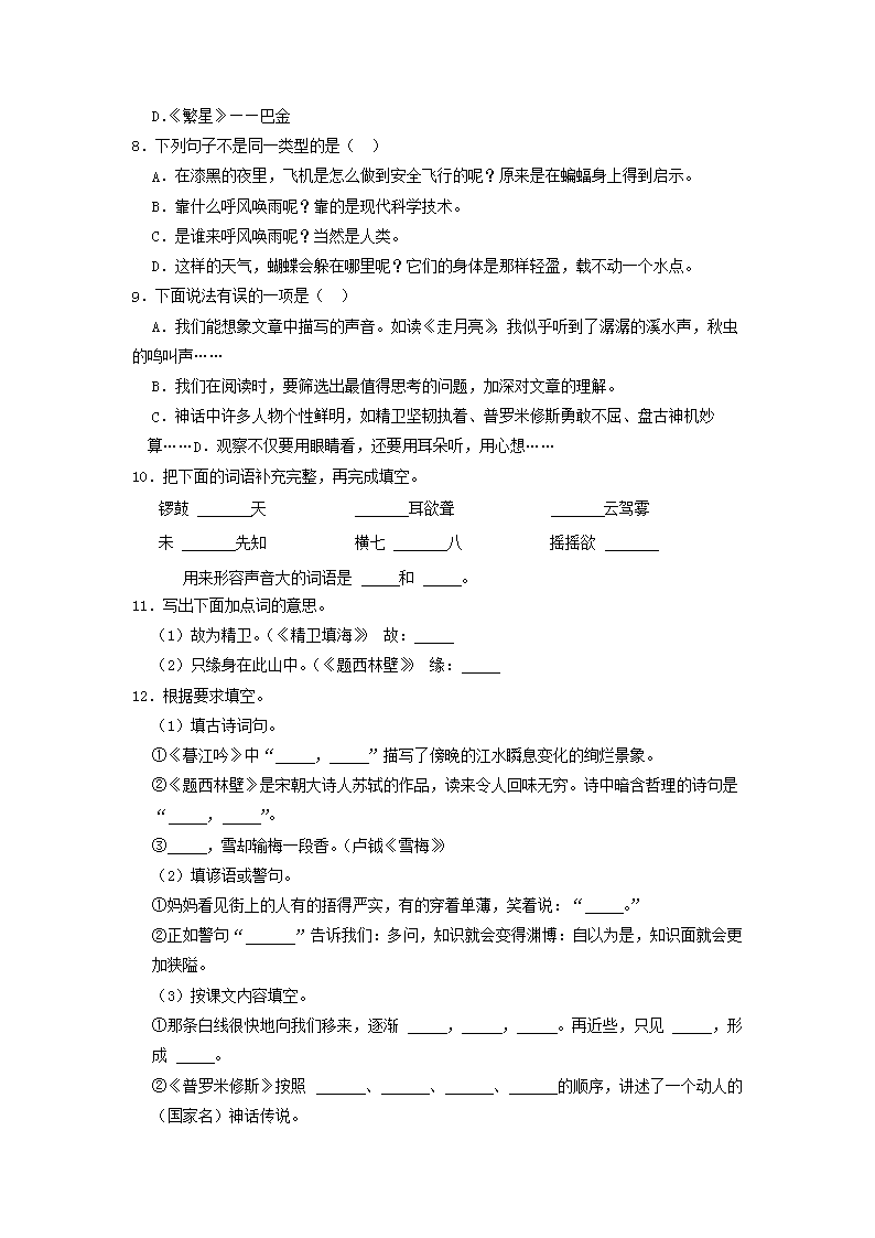 2022-2023学年江苏省南通市如东县四年级上学期期中语文真题及答案(Word版)09-16