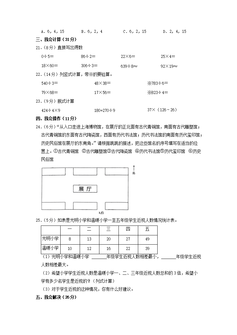 2022-2023学年浙江省温州市瑞安市三年级下学期中数学试卷及答案(Word版)09-05