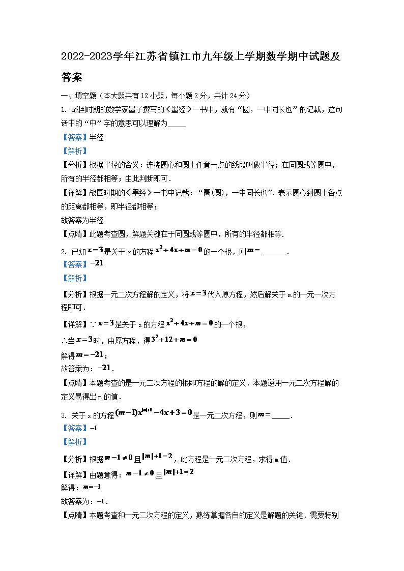 2022-2023学年江苏省镇江市九年级上学期数学期中试题及答案(Word版)09-26