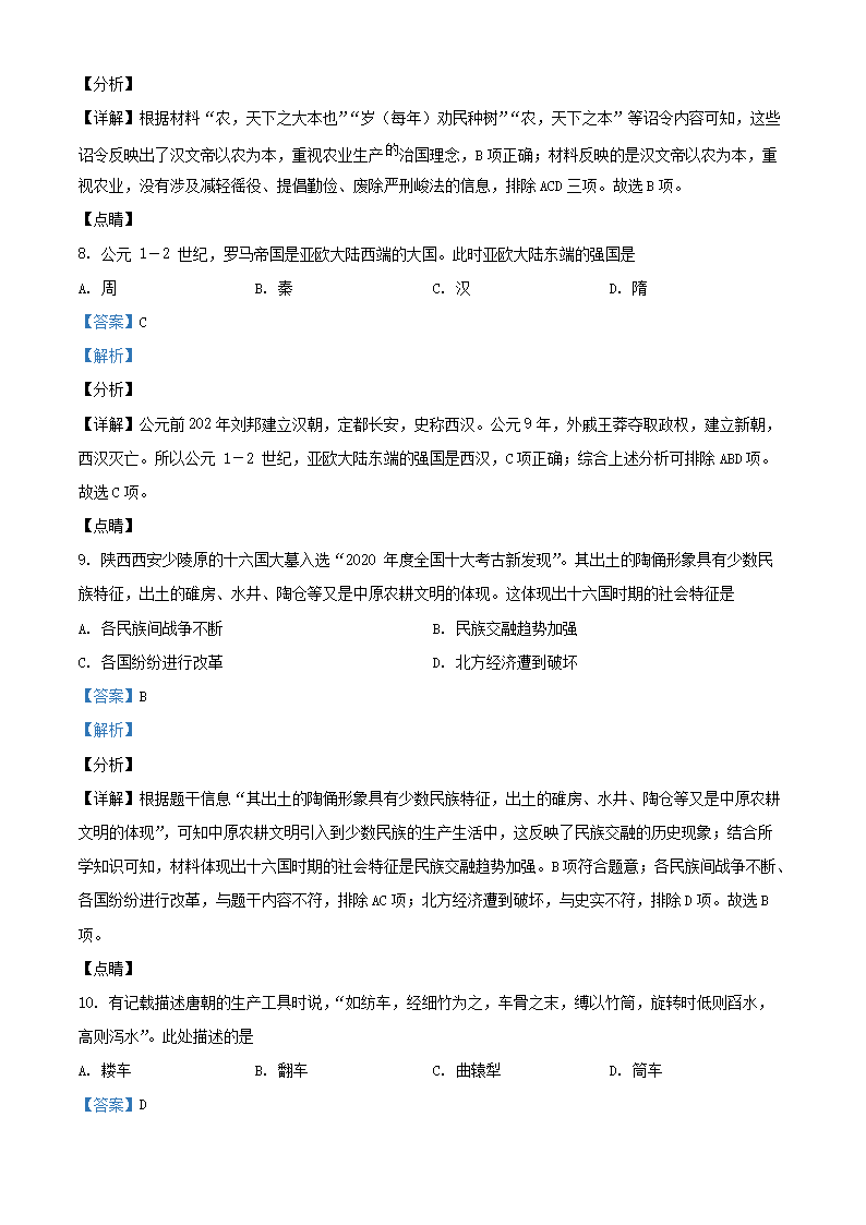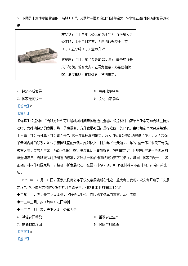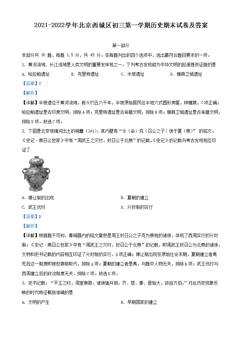 2021-2022学年北京西城区初三第一学期历史期末试卷及答案(Word版)06-28