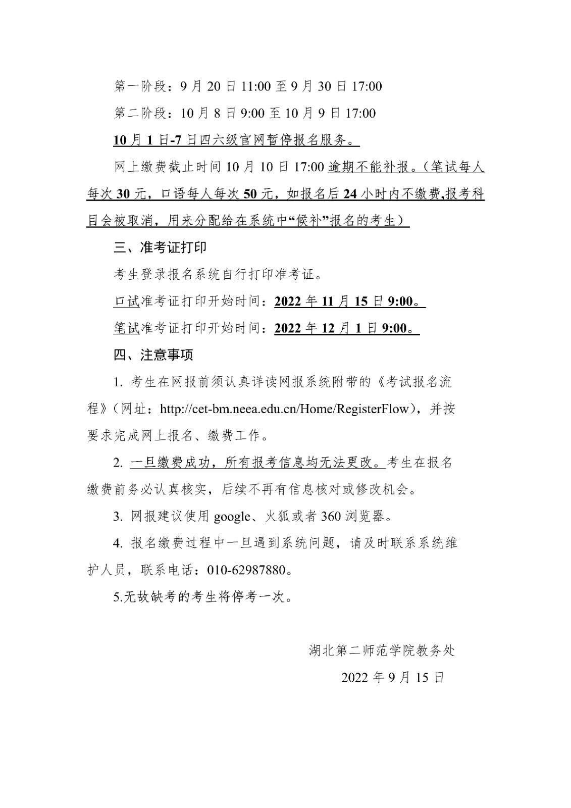 2022年下半年湖北第二师范学院外国语学院英语四、六级考试报名有关事项的通知09-28