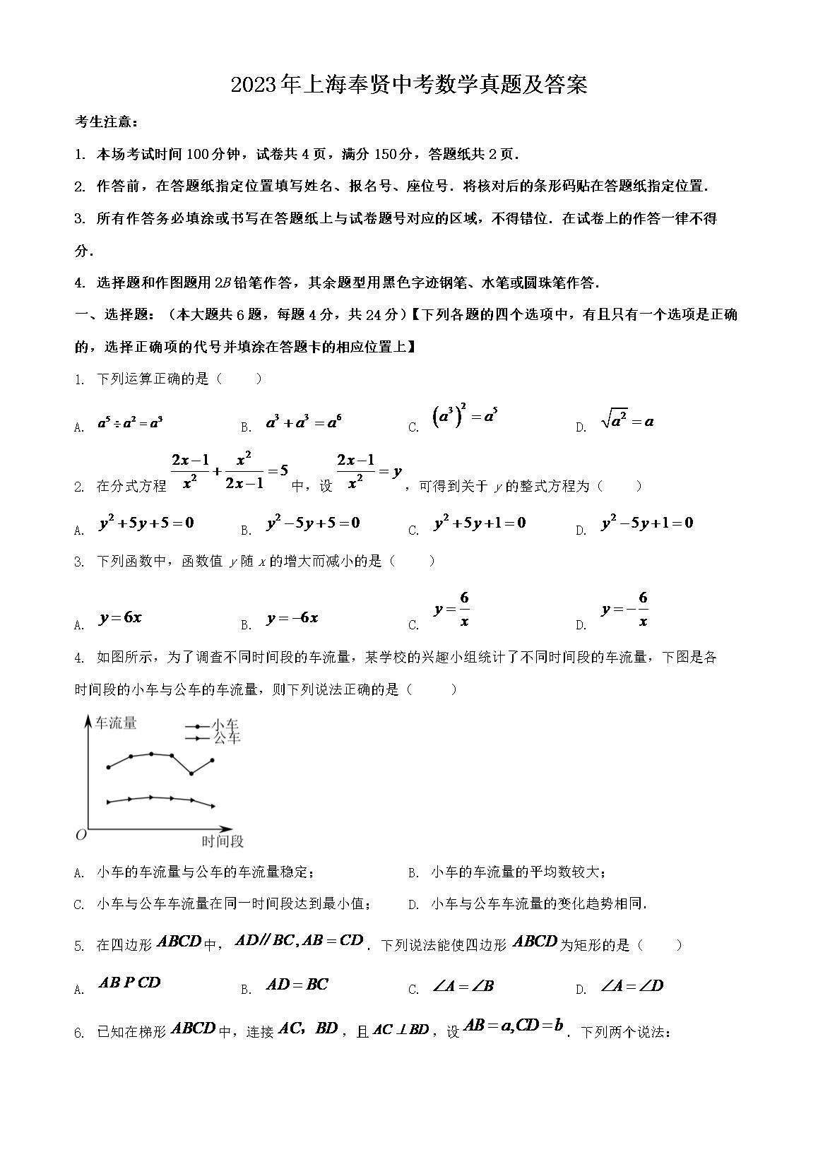 2023年上海奉贤中考数学真题及答案(Word版)06-22