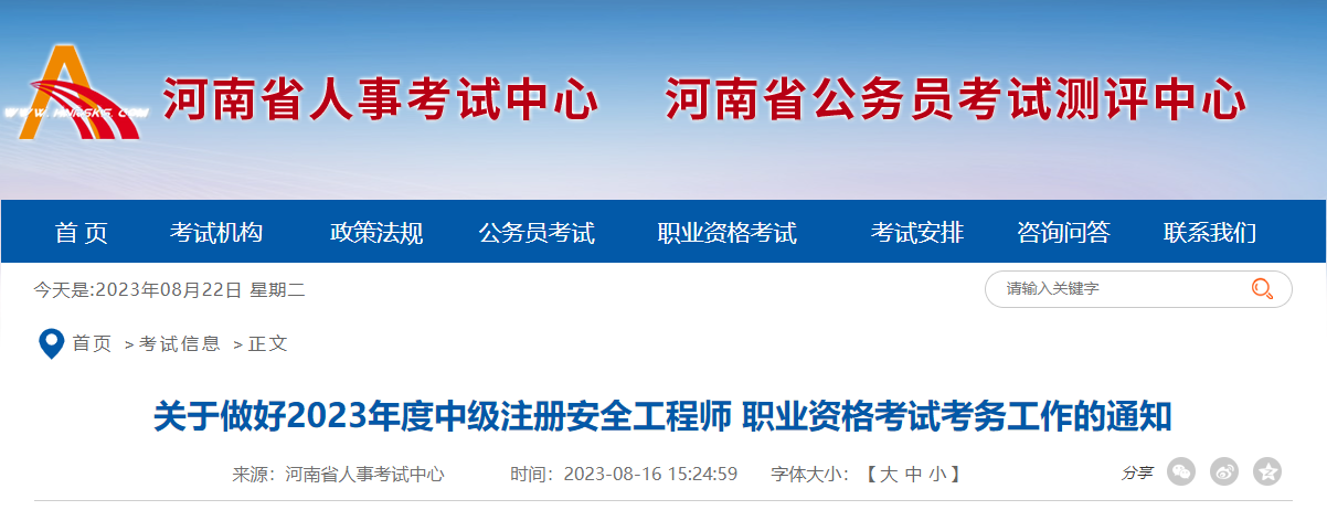 【#安全师考试# 导语】®文档大全网从河南省人事考试中心获悉,《2023年河南中级注册安全工程师职业资格考试考务工作通知》现已公布,®文档大全网从公告中了解到,符合条件的考生可在8月22日-9月1日进行网上报名,2023年河南中级安全工程师报考条件如下: