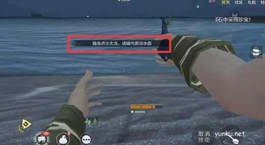 2、之后手持钓鱼竿进入垂钓状态,接着通过滑动和点击屏幕来抛出鱼竿。(如果看到瞄准点水太浅的提示,可以将视野稍微往上调一点,之后将鱼竿抛往更远的深水处)