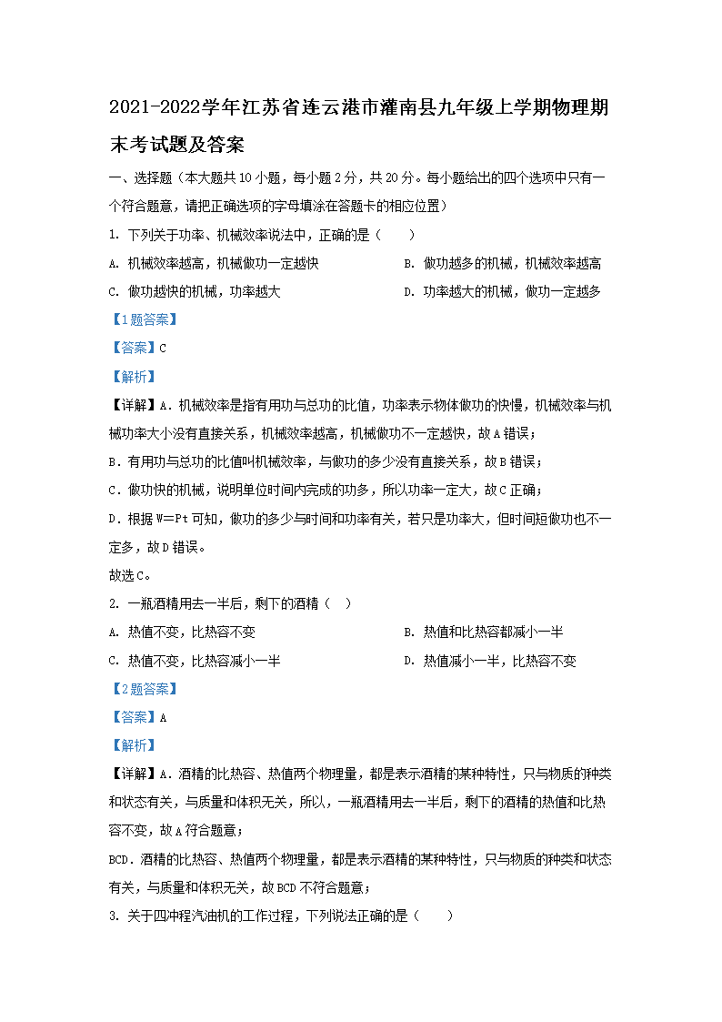 2021-2022学年江苏省连云港市灌南县九年级上学期物理期末考试题及答案(Word版)10-09