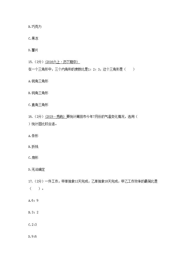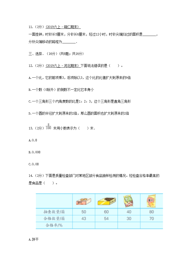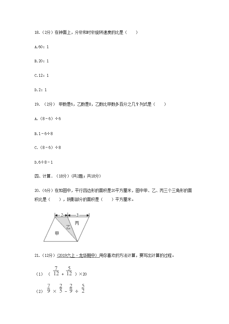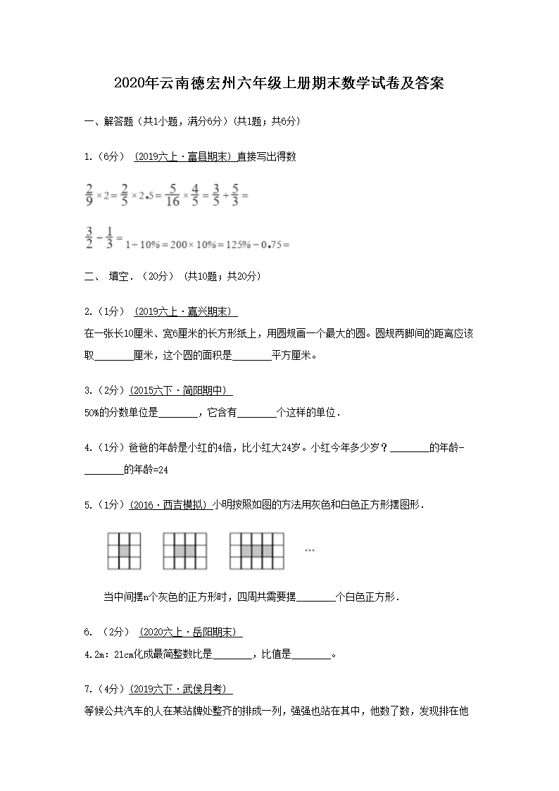 2020年云南德宏州六年级上册期末数学试卷及答案(Word版)08-31