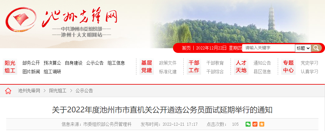 2022年安徽池州市直机关遴选公务员面试延期举行通知12-23
