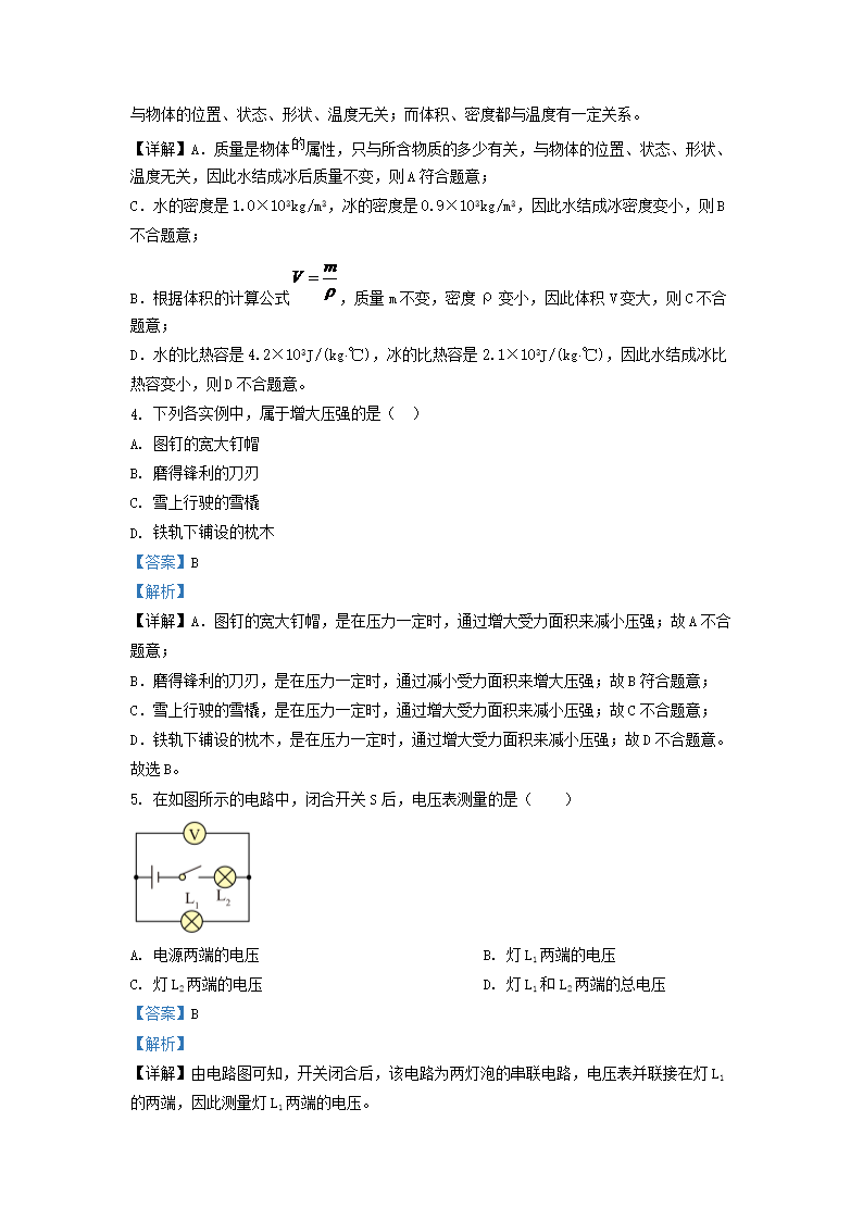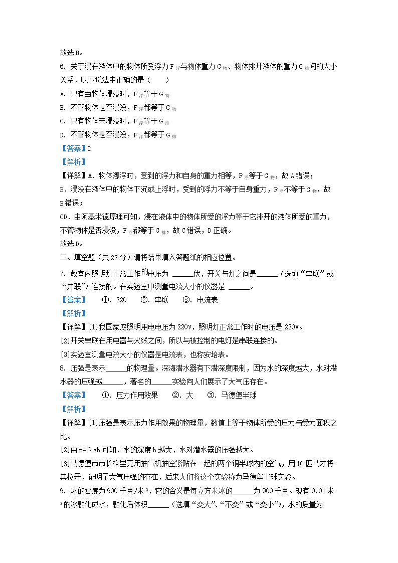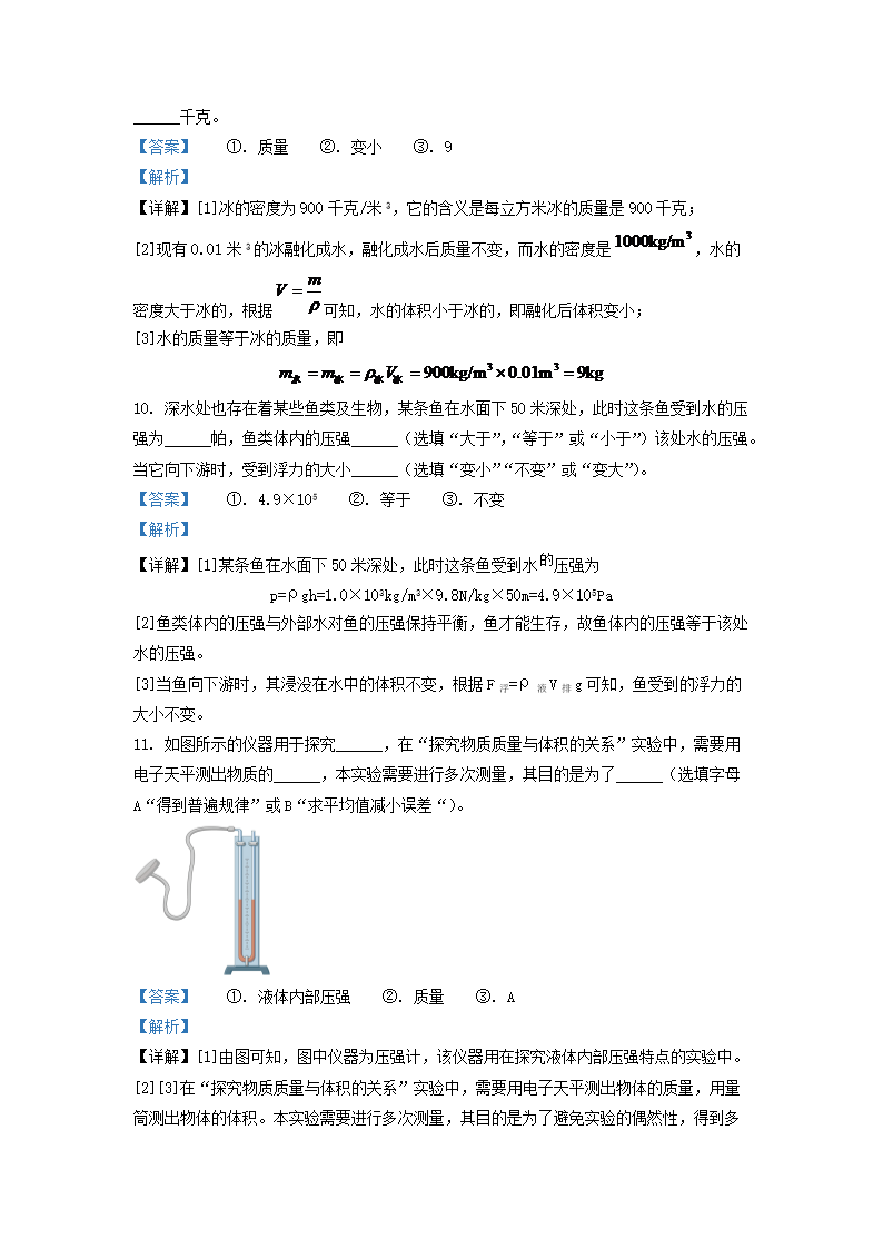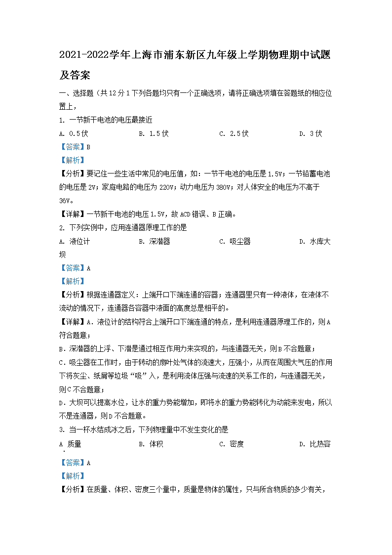 2021-2022学年上海市浦东新区九年级上学期物理期中试题及答案(Word版)10-21