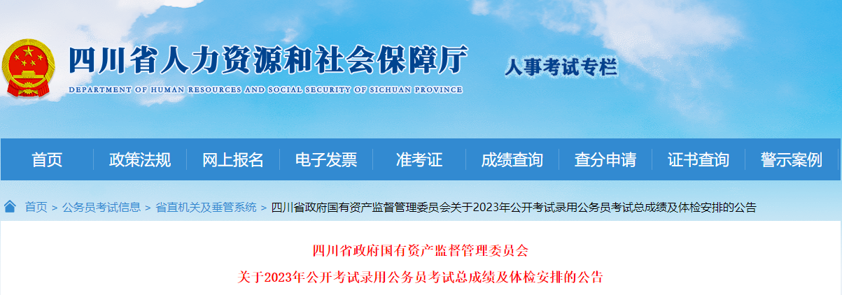 根据《中共四川省委组织部关于2023年省级机关(单位)公开考试录用公务员(参照管理工作人员)的公告》《中共四川省委组织部关于做好2023年全省公务员考录面试、体检和考察等工作的通知》等规定,现将四川省政府国有资产监督管理委员会2023年度公开考试录用公务员考试总成绩及体检安排公告如下。