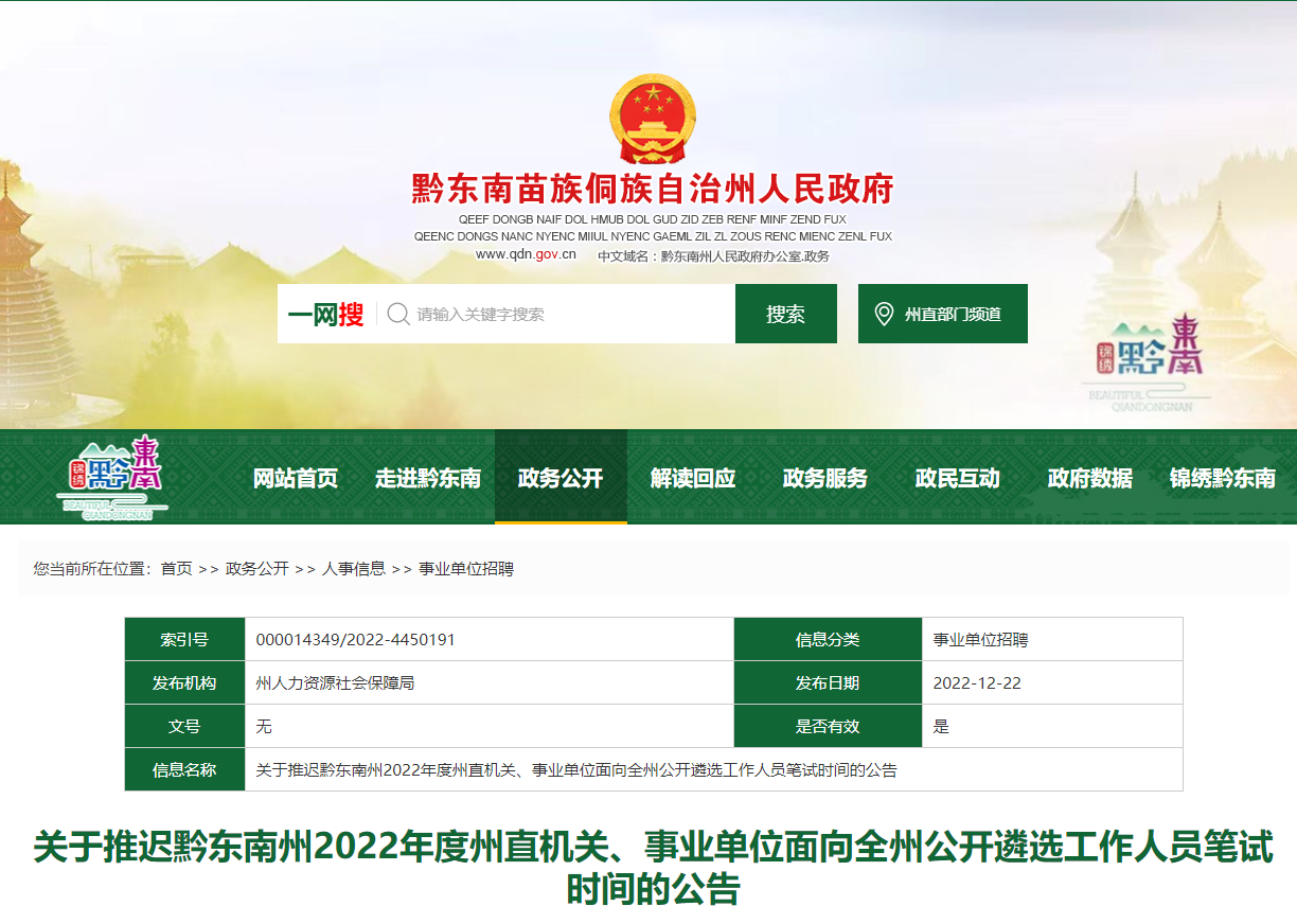 鉴于当前新冠肺炎疫情防控形势,为确保考试安全,经研究,决定推迟原定于2022年12月31日开展的黔东南州2022年度州直机关、事业单位面向全州公开遴选工作人员笔试。重启打印笔试准考证时间和笔试时间将根据疫情防控情况另行通知。请报考人员密切关注“黔东南组织工作”(www.qdnzzb.gov.cn)、“黔东南人力资源社会保障网”(http://rsj.qdn.gov.cn/)发布的相关信息,了解最新考试安排。