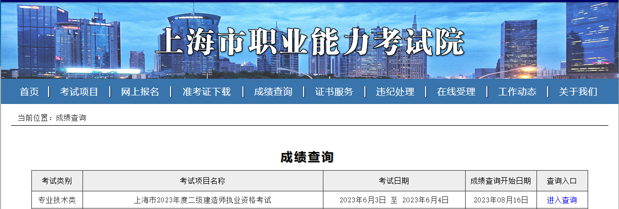 2023年上海二级建造师考试成绩查询时间:8月16日起,报考人员通过“上海市职业能力考试院(www.rsj.sh.gov.cn)”查询考试成绩!