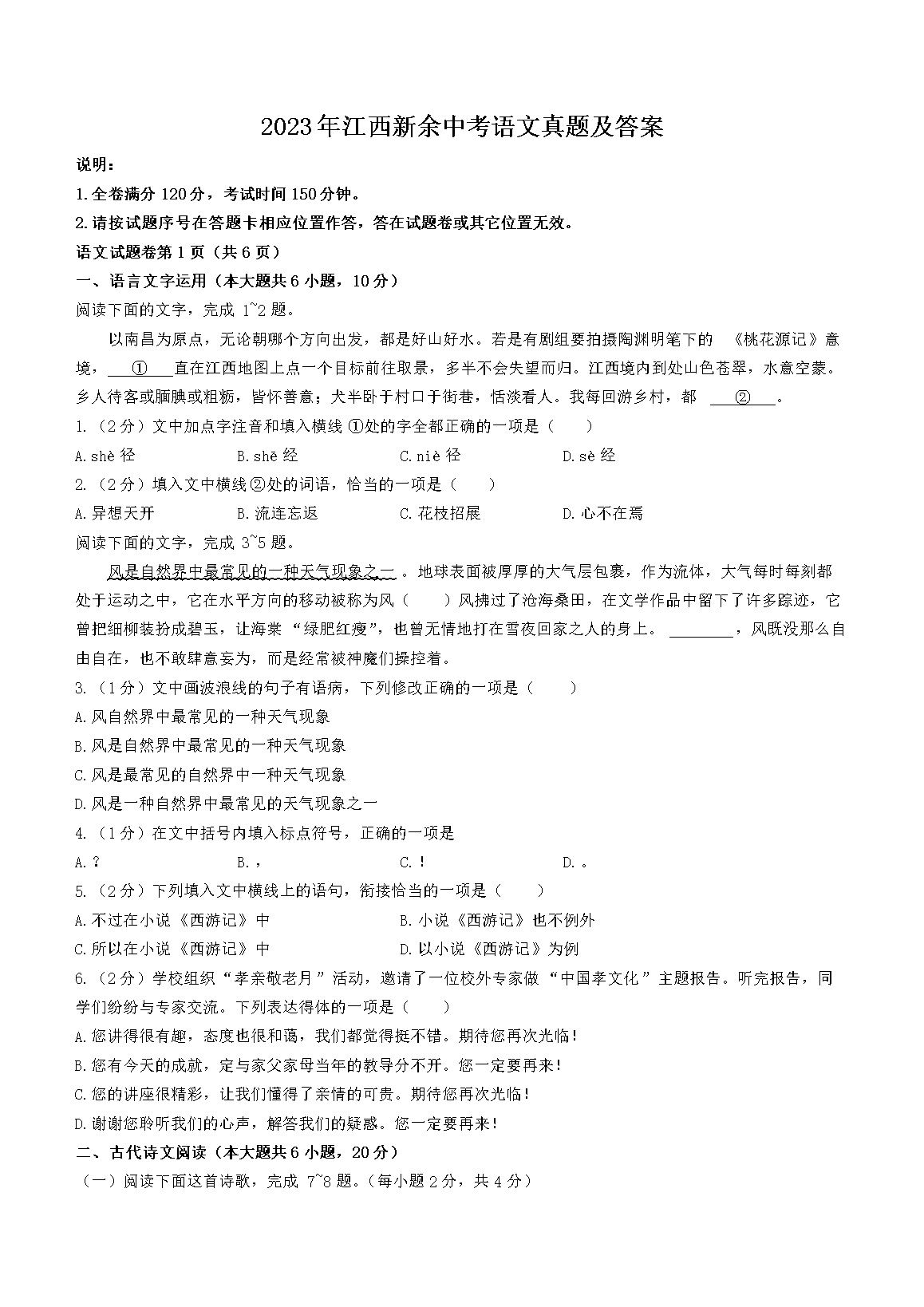 【文档预览】 文档大全网整理发布2023年江西新余中考语文真题及答案(Word版),前五页预览如下: