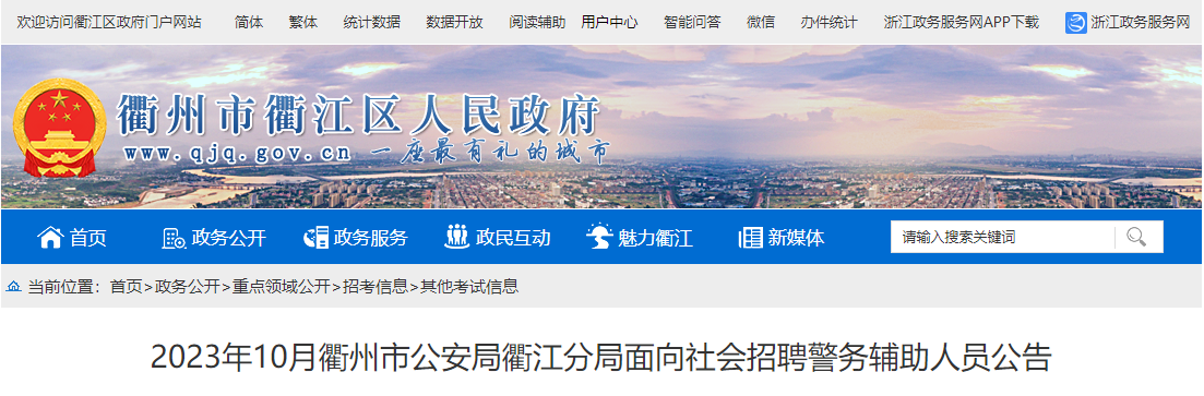 【#招警考试# #2023年浙江衢州市公安局衢江分局招聘警务辅助人员公告(11名)#】©文档大全网从衢州市衢江区人民政府获悉,2023年浙江衢州市公安局衢江分局招聘警务辅助人员11名。报名时间:10月1日-7日,考试时间:另行通知,更多事宜请参考阅读《招聘公告》,官方公告原文如下: