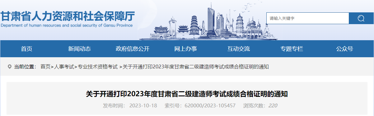 【#二级建造师考试# #2023年甘肃省二级建造师考试打印成绩合格证明通知#】®文档大全网从甘肃省人力资源和社会保障厅了解到,即日起2023年甘肃省二级建造师考试成绩合格证明开始打印,相关事宜详情如下:
