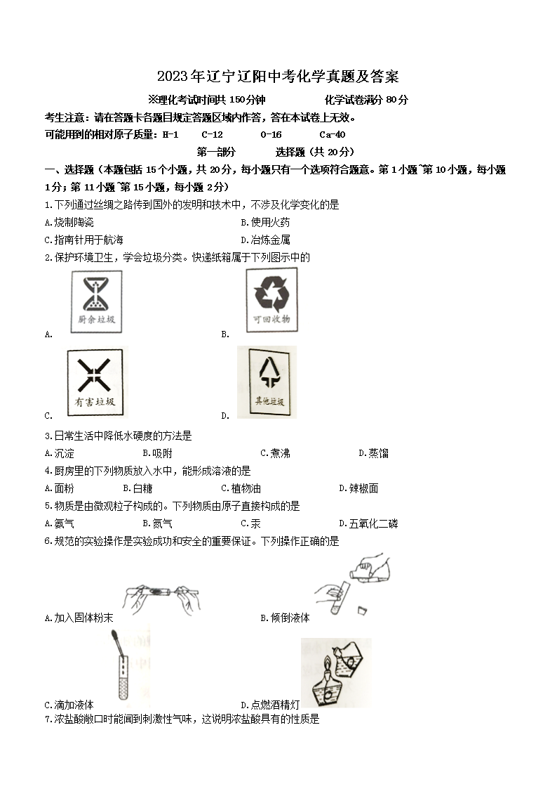 2023年辽宁辽阳中考化学真题及答案(Word版)07-04