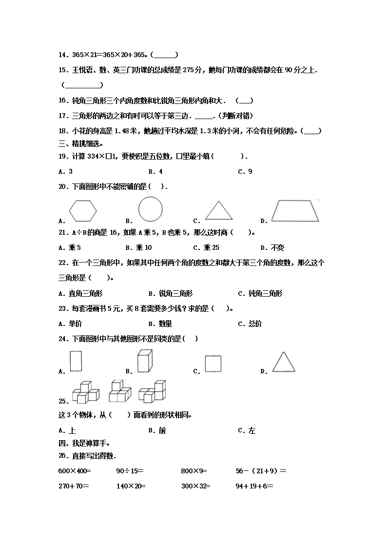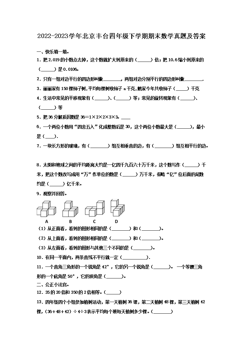 2022-2023学年北京丰台四年级下学期期末数学真题及答案(Word版)07-11