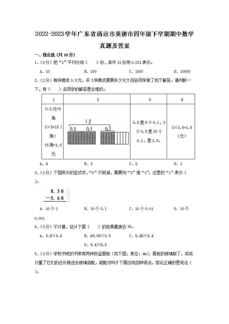 2022-2023学年广东省清远市英德市四年级下学期期中数学真题及答案(Word版)10-21