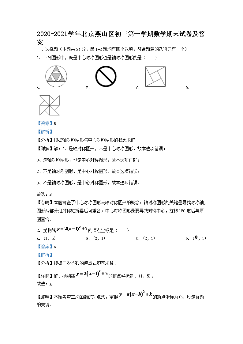【文档预览】 文档大全网整理发布2020-2021学年北京燕山区初三第一学期数学期末试卷及答案(Word版),前五页预览如下: