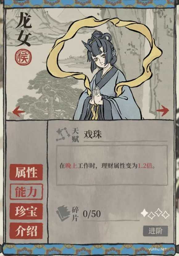 1、龙女是个侯级角色,适合搭配增加制作的珍宝,龙女的天赋在晚上发挥作用;