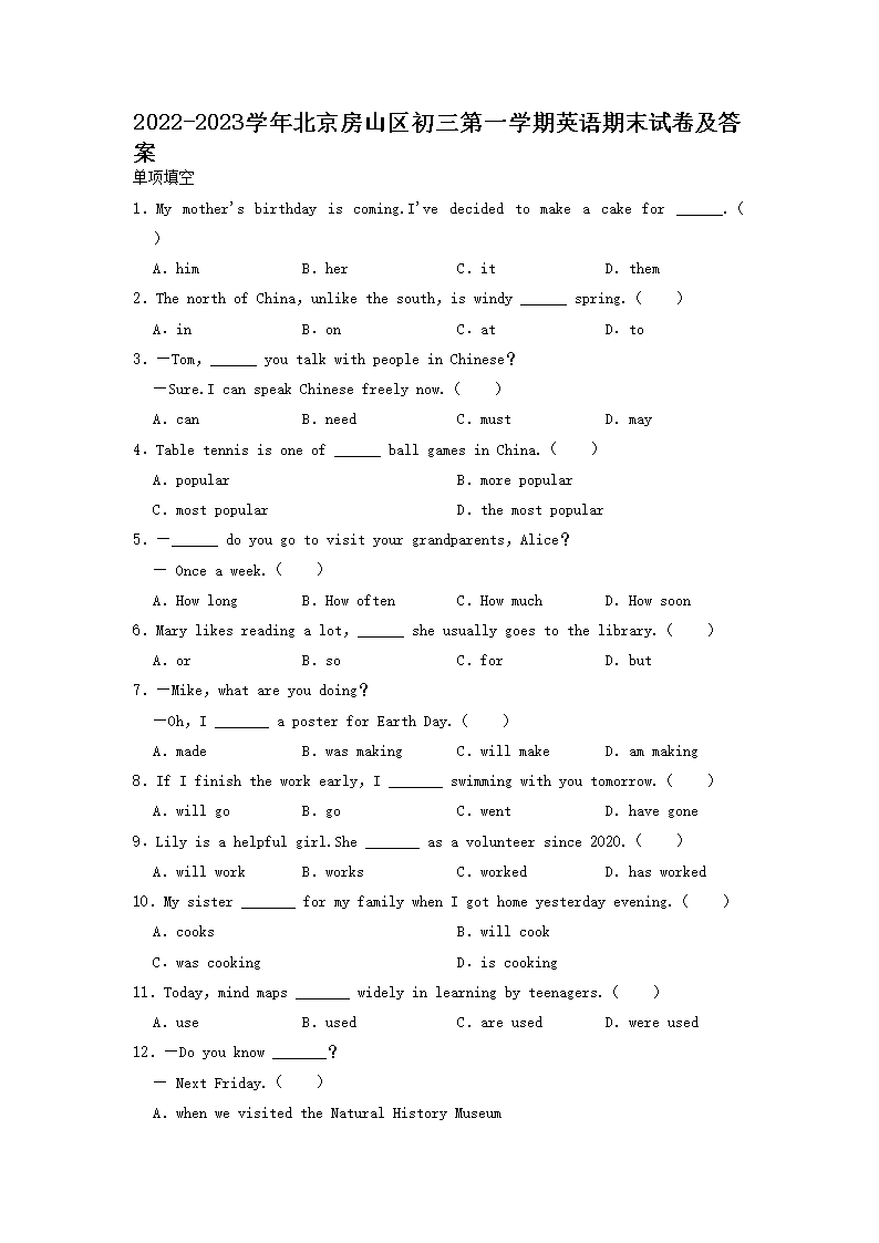 2022-2023学年北京房山区初三第一学期英语期末试卷及答案(Word版)08-16