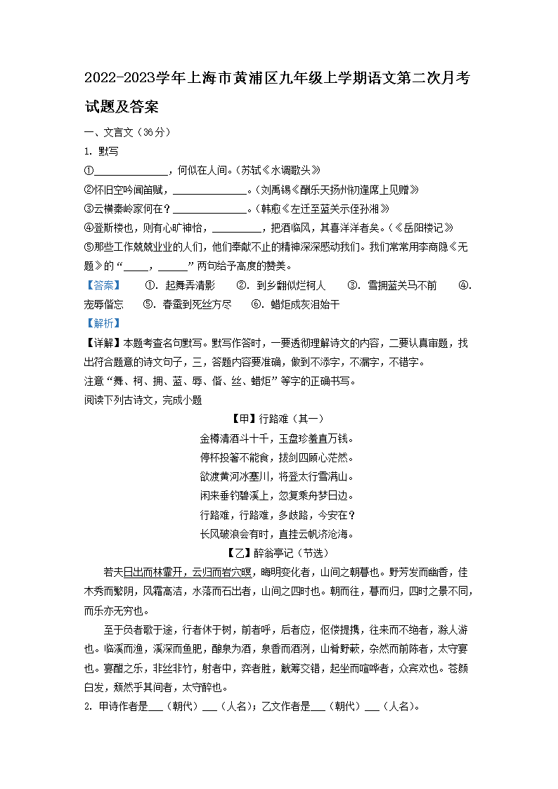 【文档预览】 文档大全网整理发布2022-2023学年上海市黄浦区九年级上学期语文第二次月考试题及答案(Word版),前五页预览如下: