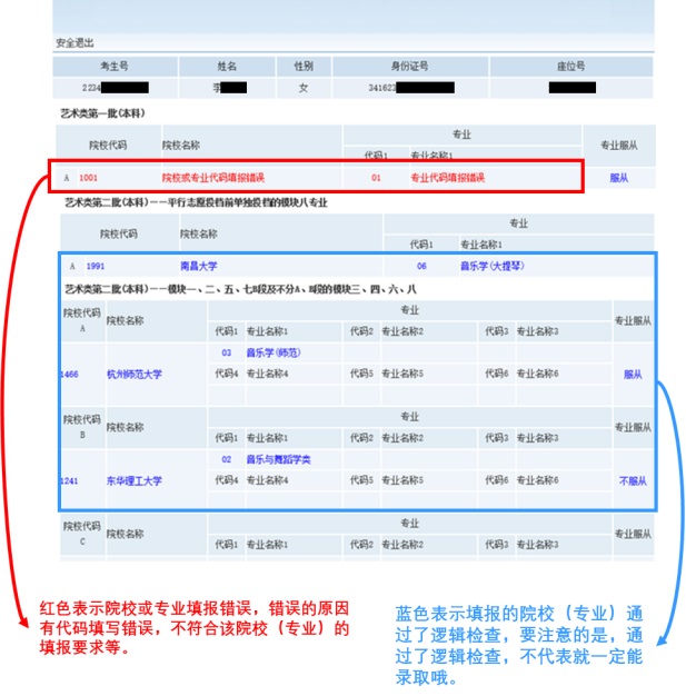 志愿信息经系统逻辑检查,蓝色字体表示通过检查的院校名称和专业名称。红色字体表示该院校志愿或专业志愿代码填写错误,或不不符合招生要求。