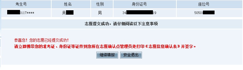 信息提交成功后将看到下面的页面,如果下面的页面没有出现,可能您的志愿没有填报成功,请到志愿填报点老师处咨询。