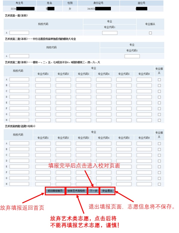 “放弃艺术类院校”按钮:放弃艺术类院校志愿,不填报艺术类的院校。一旦放弃,考生将不能再次填报该类院校录取,请慎重操作。