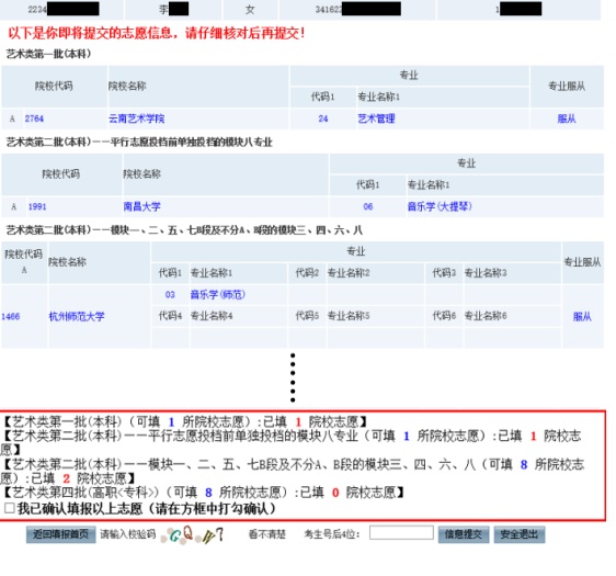 请考生务必再次仔细核对自己的信息,确认无误后输入校验码并点击“信息提交”按钮提交志愿信息,信息一旦提交将无法重填或修改,请慎重操作。