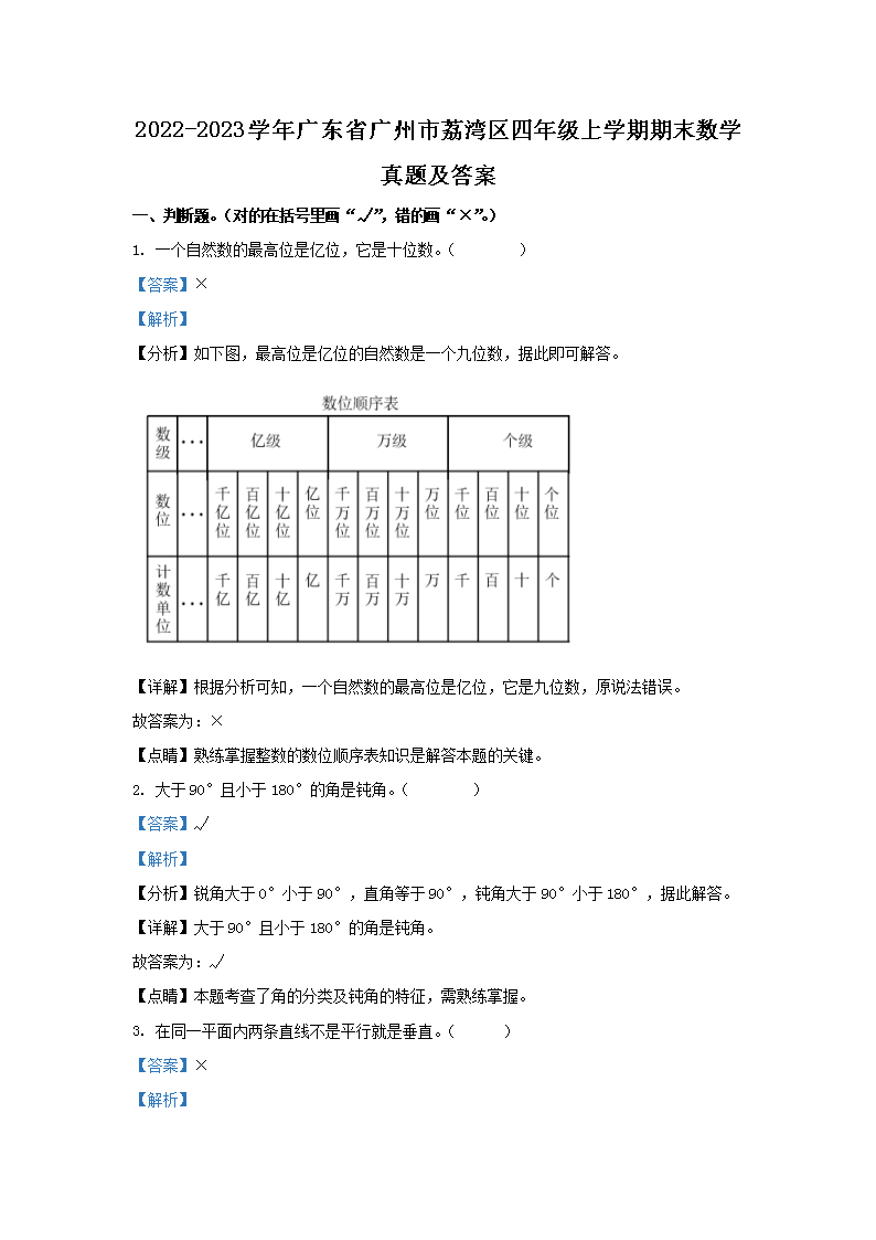 2022-2023学年广东省广州市荔湾区四年级上学期期末数学真题及答案(Word版)10-19