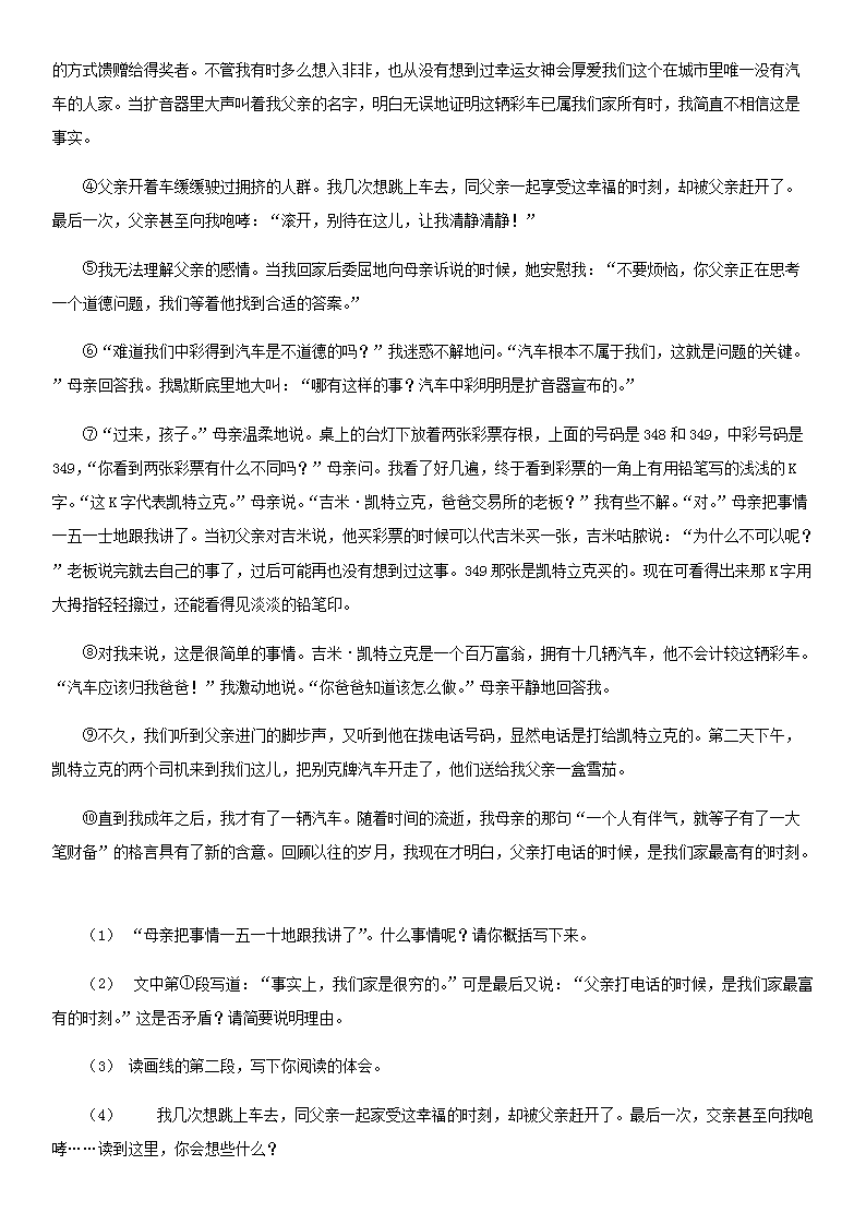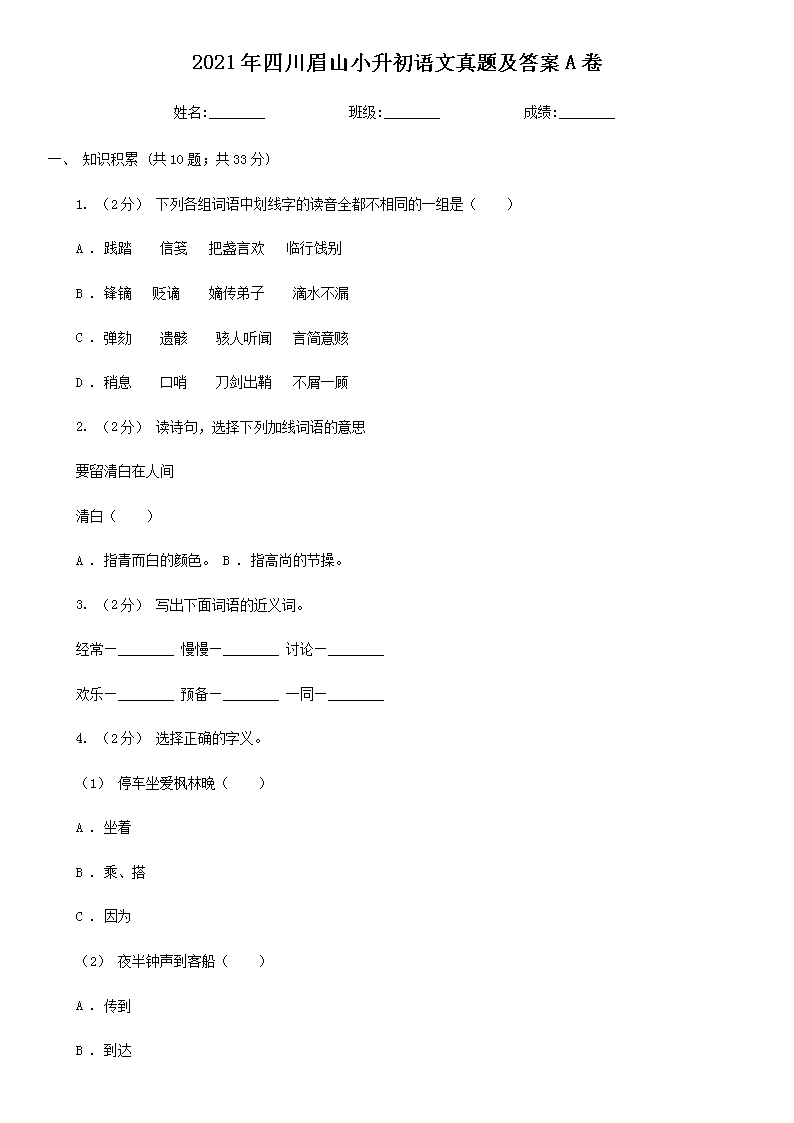 2021年四川眉山小升初语文真题及答案A卷(Word版)08-30
