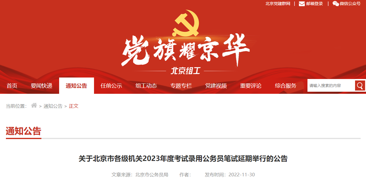 北京组工网11月30日发布了《关于北京市各级机关2023年度考试录用公务员笔试延期举行的公告》,原文如下: