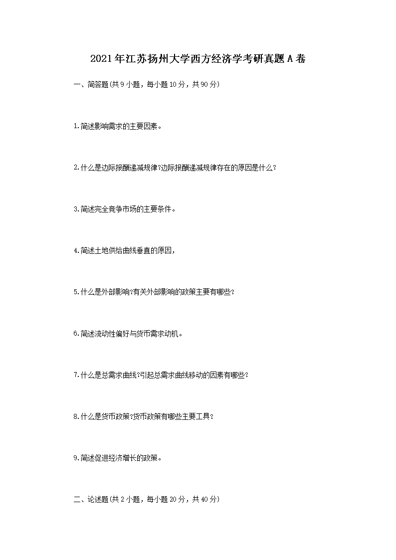 2021年江苏扬州大学西方经济学考研真题A卷(Word版)08-29