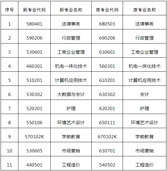 本次专业名称、代码调整涉及我省现行开考的11个专科专业,调整后的新旧专业名称及代码对照情况详见《江西省自学考试专科新旧专业对照表》(见附件)。