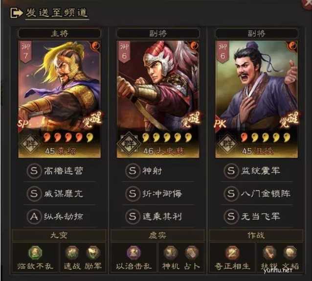 这些降统效果配合SP袁绍自带的兵刃增伤,能较好地放大该队SP袁绍和太史慈的兵刃输出;而折冲降低智力的负面效果,亦可以令沮授有概率打出“法系的避实击虚”。