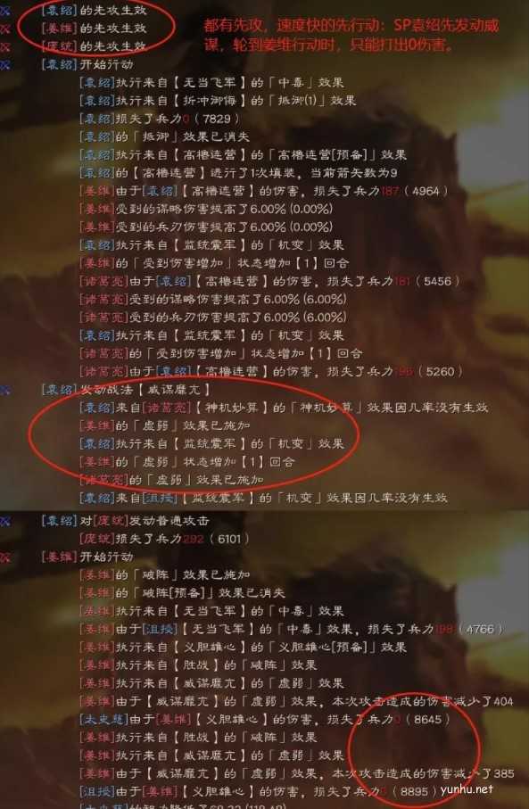 都有先攻,速度快的先行动,SP袁绍凭借先手优势发动威谋,让后手行动的姜维只能打出0伤害。