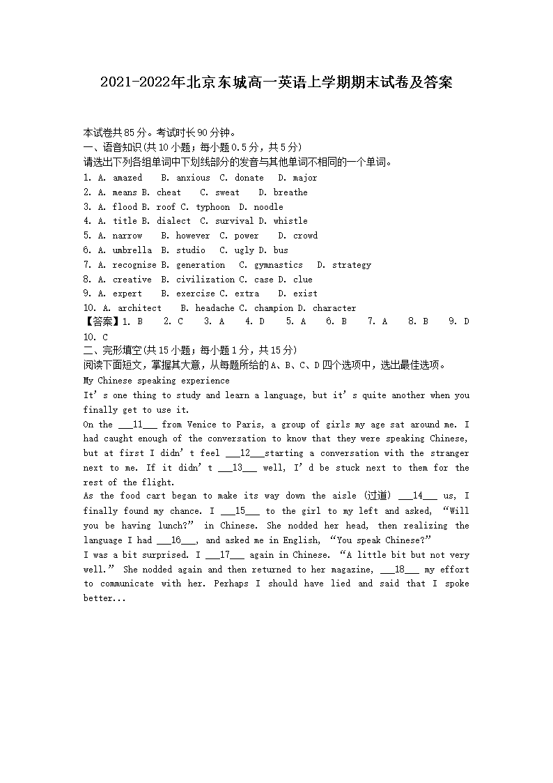 2021-2022年北京东城高一英语上学期期末试卷及答案(Word版)07-28