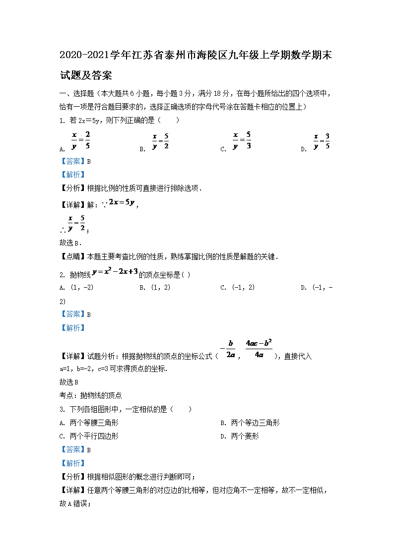 【文档预览】 文档大全网整理发布2020-2021学年江苏省泰州市海陵区九年级上学期数学期末试题及答案(Word版),前五页预览如下: