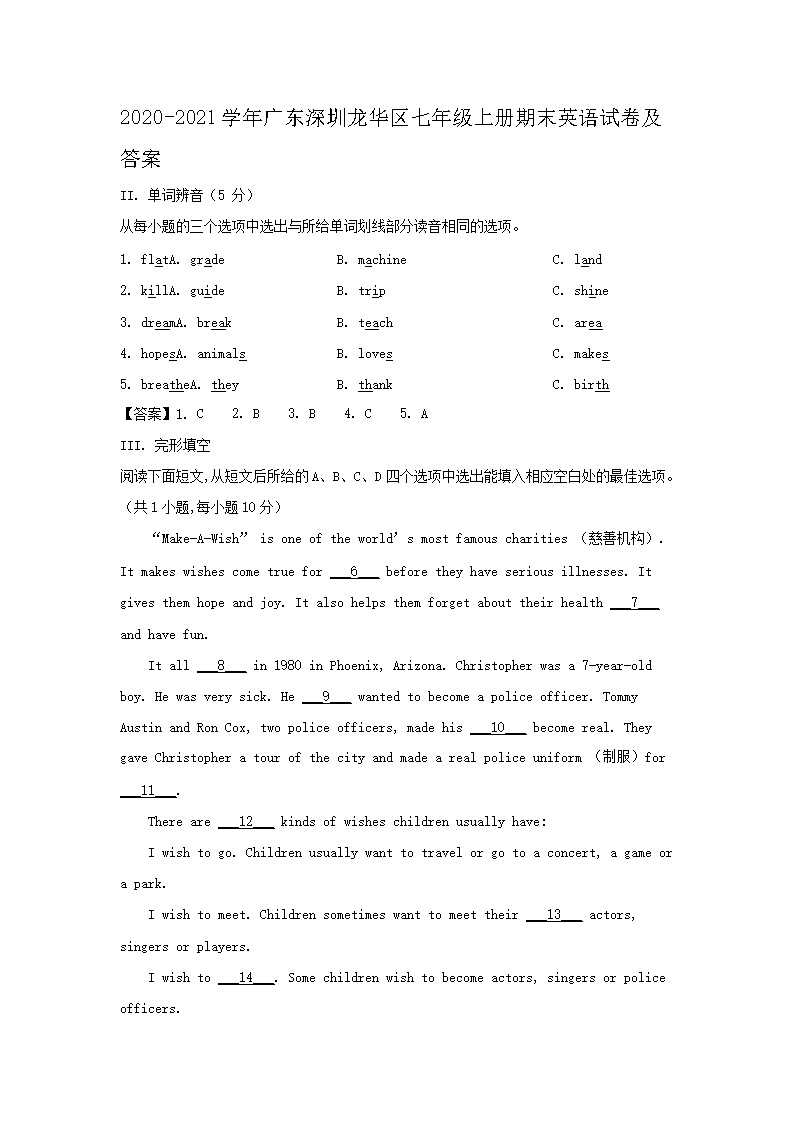 【文档预览】 文档大全网整理发布2020-2021学年广东深圳龙华区七年级上册期末英语试卷及答案(Word版),前五页预览如下: