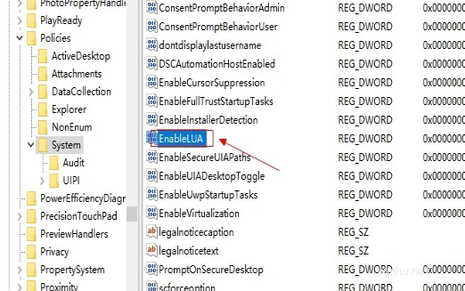 4、在打开注册表后,找到 HKEY_LOCAL_MACHINE /Software /Microsoft /Windows /CurrentVersion /Policies /System下面的 EnableLUA 项值。