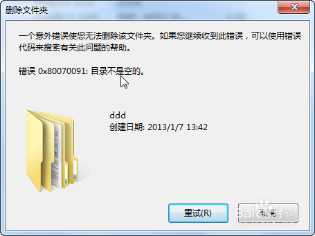 1、删除文件夹 却提示“错误 0x80070091:目录不是空的。”无法删除