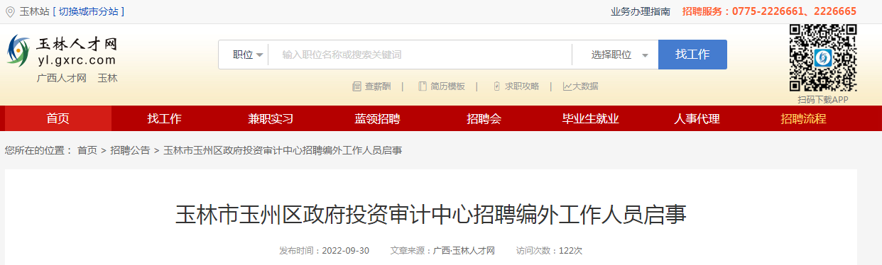 2022年广西玉林市玉州区政府投资审计中心编外工作人员招聘公告10-01