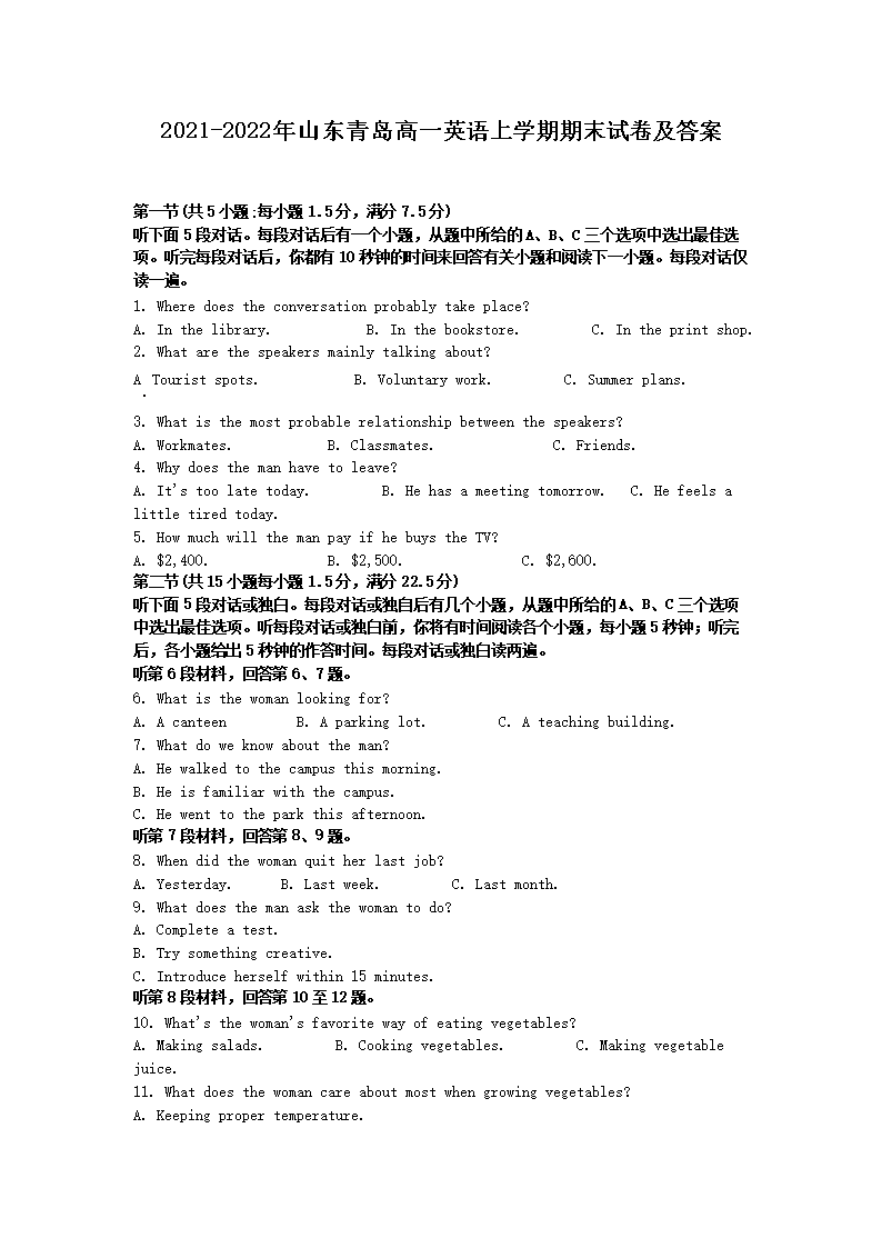 【文档预览】 文档大全网整理发布2021-2022年山东青岛高一英语上学期期末试卷及答案(Word版),前五页预览如下: