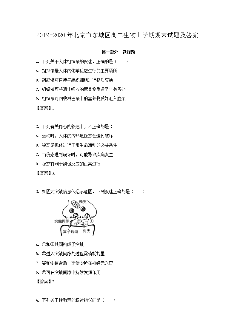 2019-2020年北京市东城区高二生物上学期期末试题及答案(Word版)06-29