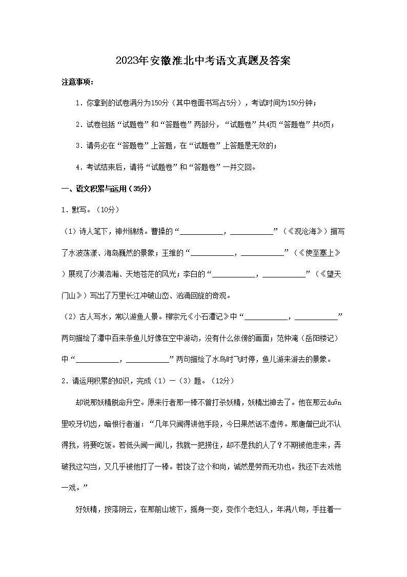 2023年安徽淮北中考语文真题及答案(Word版)06-22